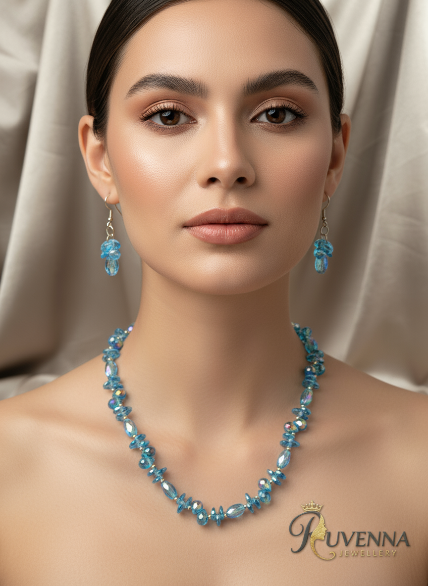 The Radiance Collection by Ruvenna Jewellery showcases elegant handcrafted necklace and earring sets designed to highlight timeless beauty. Each piece features finely cut beads that catch the light with a luxurious sparkle, complemented by subtle golden accents.