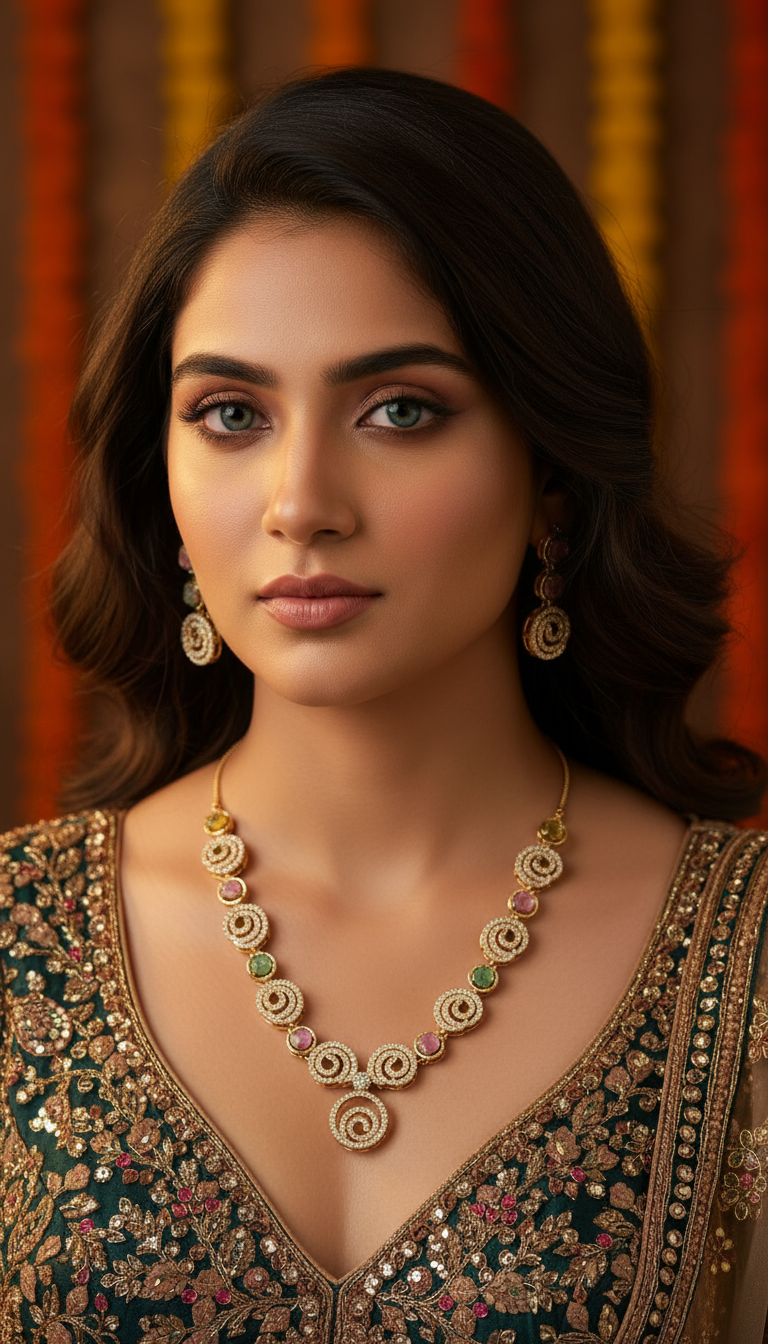 A dazzling masterpiece blending American Diamonds and Kundan stones in a mesmerizing spiral design. The Regalia Spiraluxe Necklace radiates a kaleidoscope of colour and shine — perfect for weddings, festive occasions, or royal celebrations. A statement of timeless luxury and modern artistry.